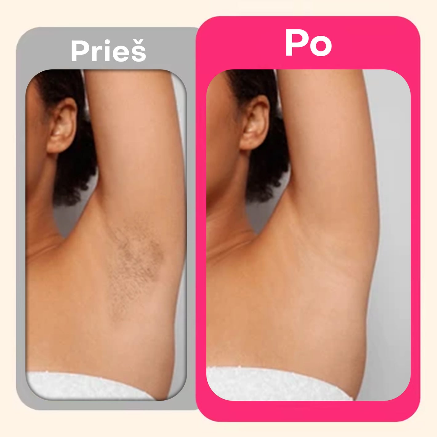 Matomas rezultatas jau po kelių procedūrų – oda tampa lygi, švelni ir be nepageidaujamų plaukelių.